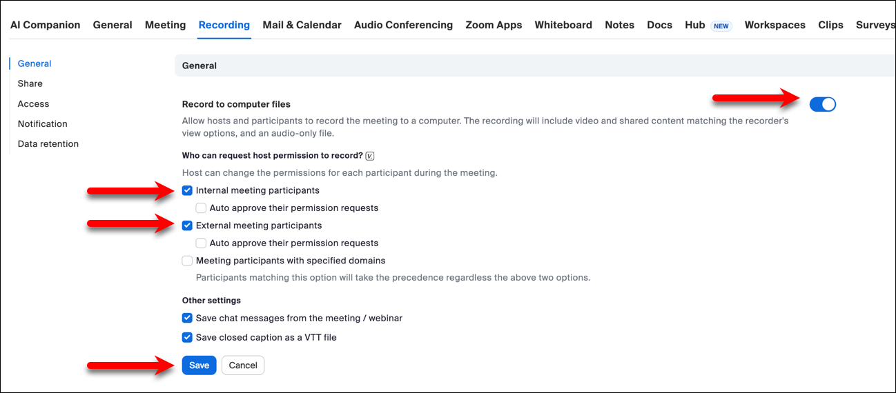 - In the Local Recording section, make sure Record to computer files is enabled. Make sure to also check the boxes beside Internal meeting participants and/or External meeting participants.