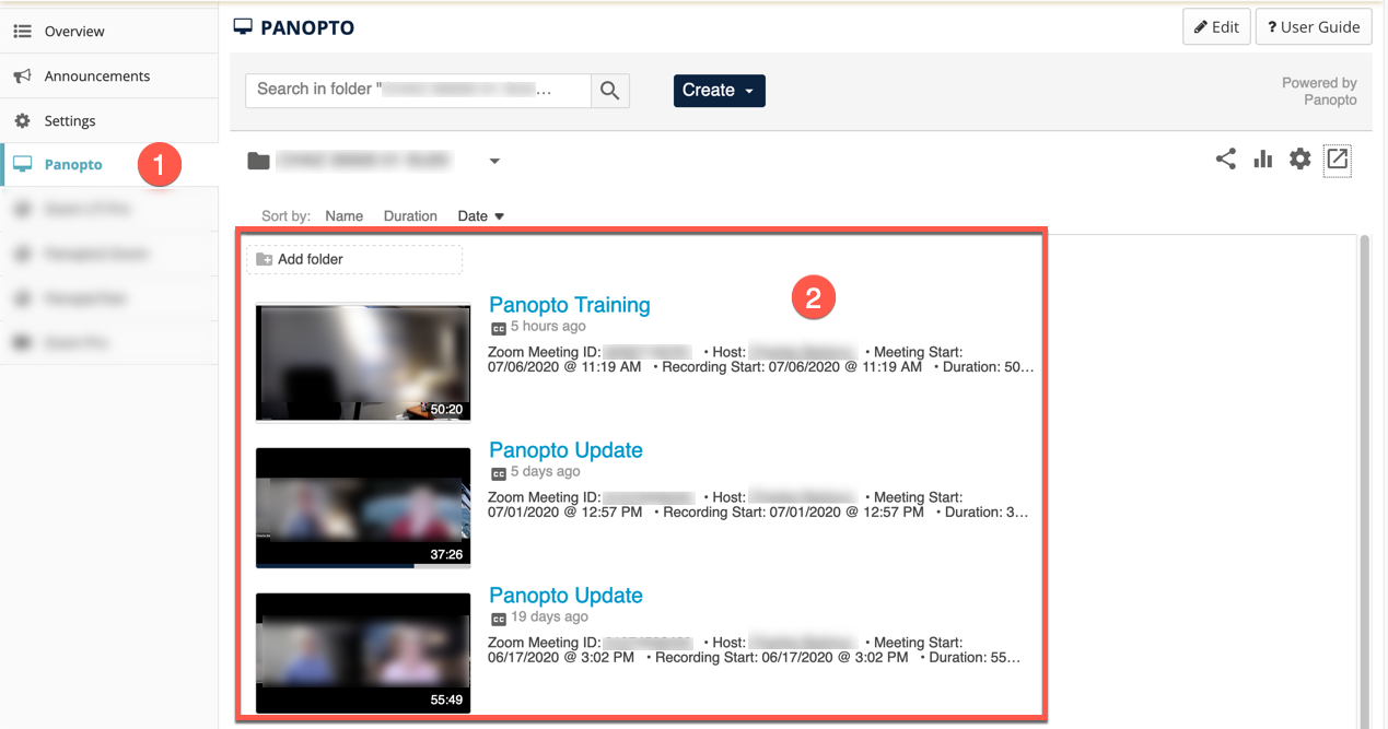 - Open the Meeting Recordings folder. (This folder will not appear until Panopto has imported a Zoom cloud recording.)