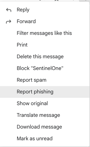 First, you need to identify the email message as either Spam Or Phishing. Then it is essential that you report it following the instructions below to provide both Google and ND systems with the technical details that can be utilized to reduce future messages of this type:
