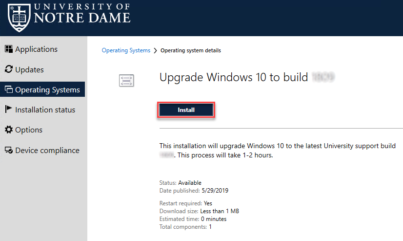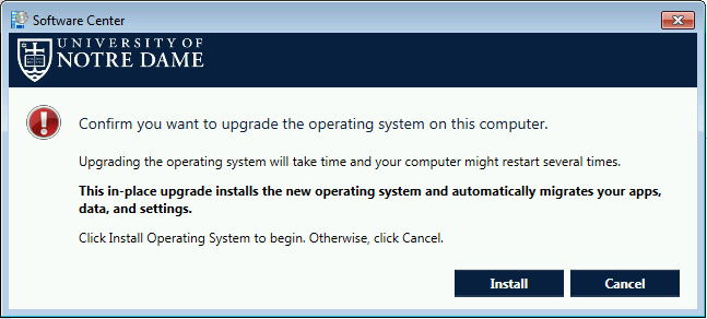 7. Click Install to begin the upgrade. Note: This may take a couple of hours and your computer will reboot several times throughout the process.