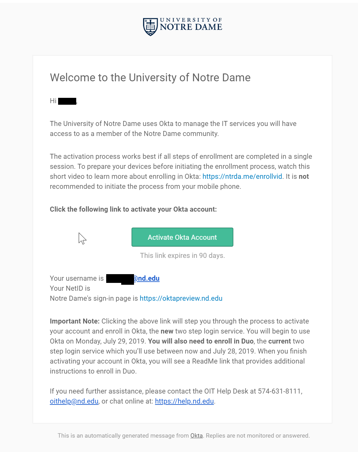 When a new NetID (username) is created for an individual, they will receive an email to their personal (non-ND) email address with instructions on how to begin. Check your personal account that you provided in your admission or hiring materials for an email with the subject line "Activate your Notre Dame account." This email is sent by noreply@okta.com, and the link in this email remains active for 90 days. Below is an example of this email: