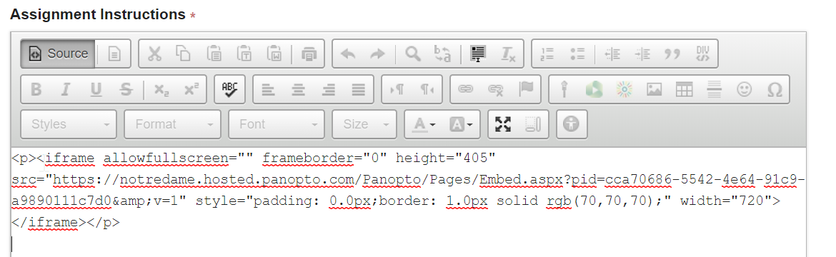6. Navigate to where you would like to embed the playlist in Sakai. This could be an assignment, lesson page, or any location where the rich text editor is available in Sakai.