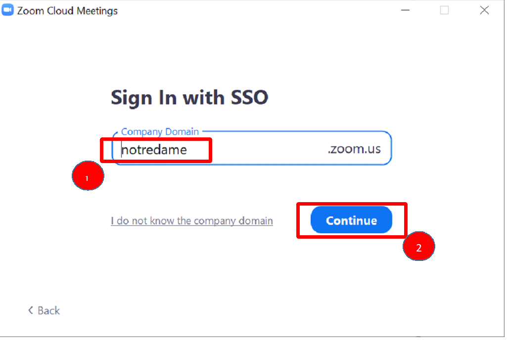 5. Enter in “notredame” in the Company Domain field and click Continue.