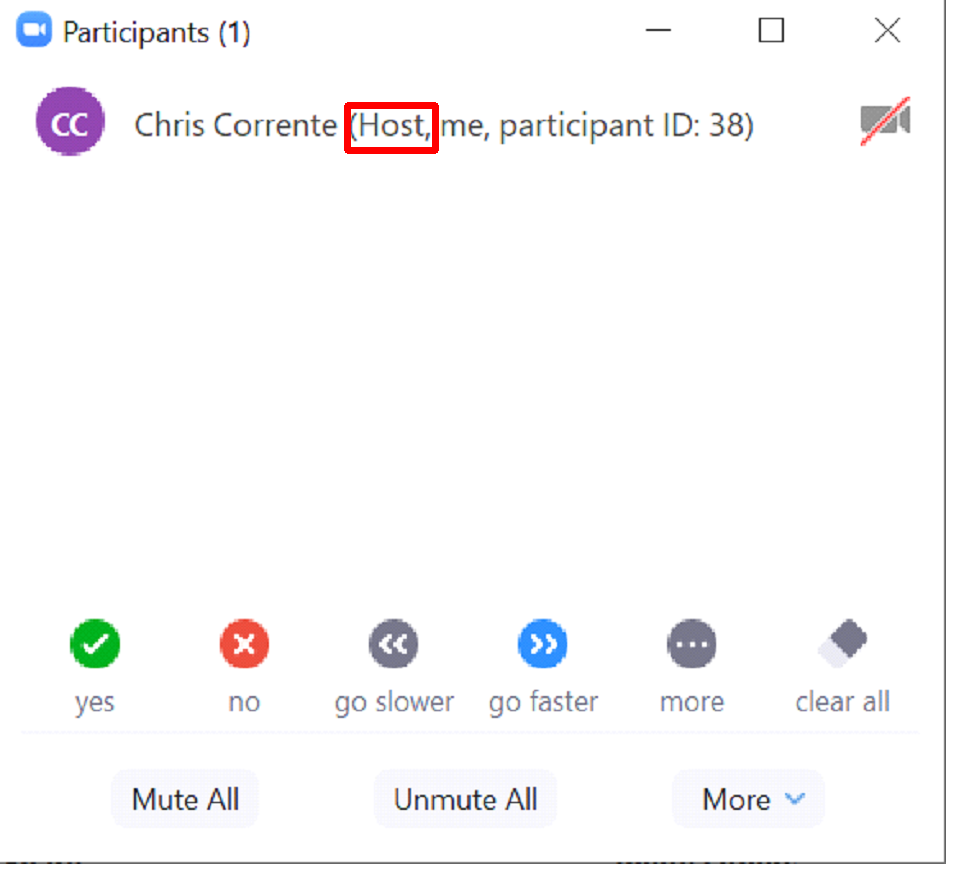 7. Click on the Participants button in lower navigation of Zoom to confirm you are listed as the host. You should now have all the permissions needed as the host.