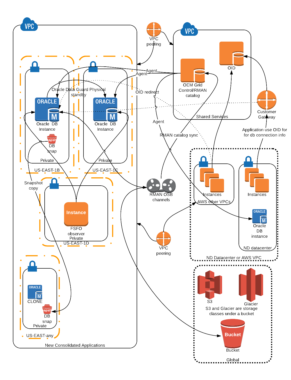An EC2 instance provides the same functionality as physical machine that we use in our data center, except that there is no console access available. We will use only HVM (http://docs.aws.amazon.com/AWSEC2/latest/UserGuide/virtualization_types.html) instances. EC2 offers the added benefit of “upgrading” to a larger instance without the need to reinstall. Minimal reconfiguration of the software on the instance may be needed (e.g. oracle sga memory).