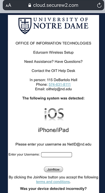 (Note: If you are configuring wifi on an Apple Watch, it must be done through its associated iPhone) - The page should identify your operating system. Enter your netid@nd.edu and tap JoinNow
