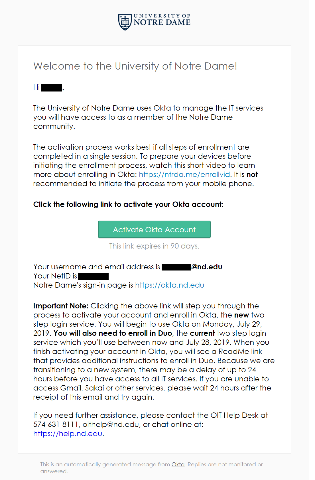 When a new NetID (username) is created for an individual, they will receive an email to their personal (non-ND) email address with instructions on how to begin. Check your personal account that you provided in your admission or hiring materials for an email with the subject line "Activate your Notre Dame account." This email is sent by noreply@okta.com, and the link in this email remains active for 90 days. Below is an example of this email: