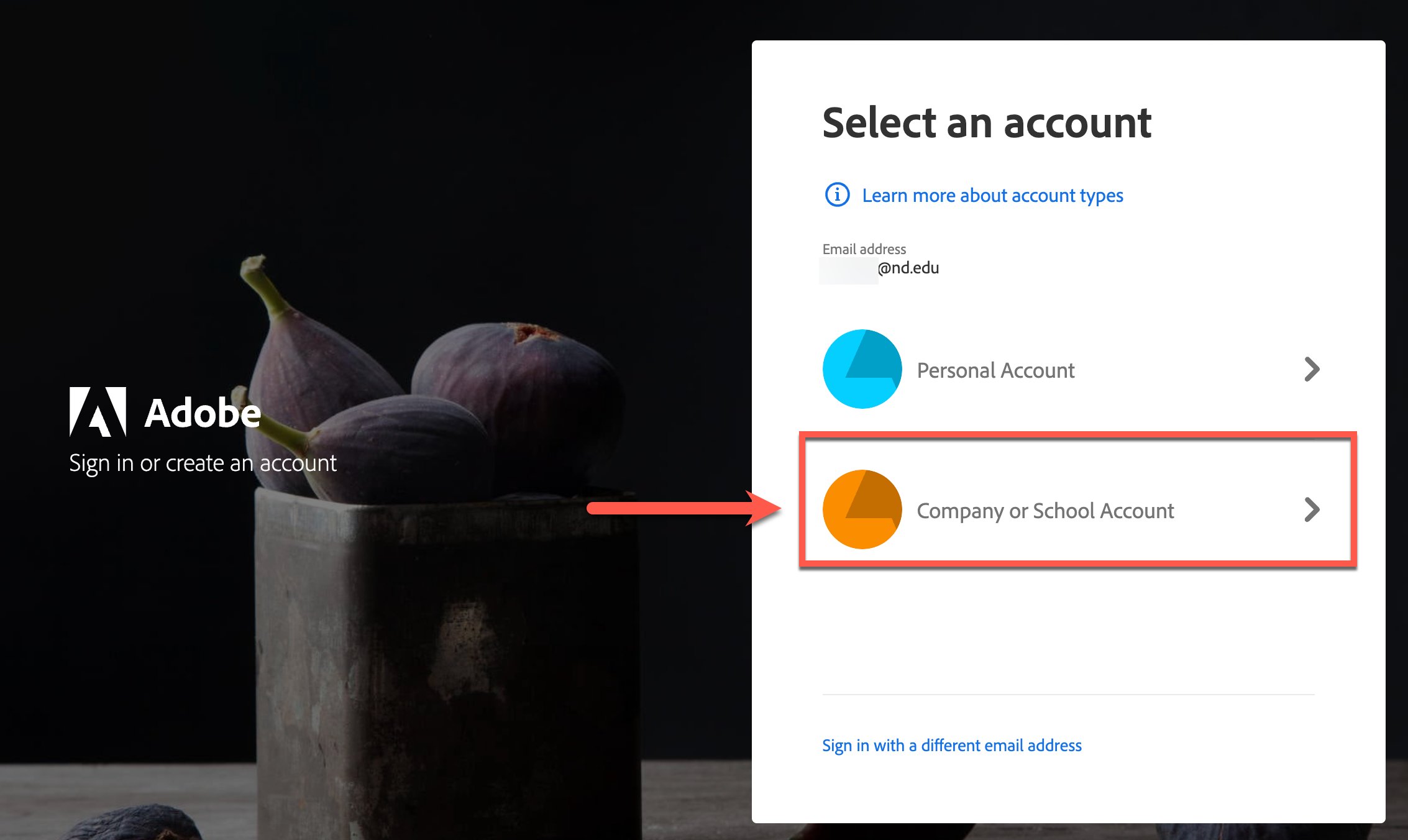 4. After authentication, you may be prompted to select an account type. If this screen appears, select the option Company or School Account.