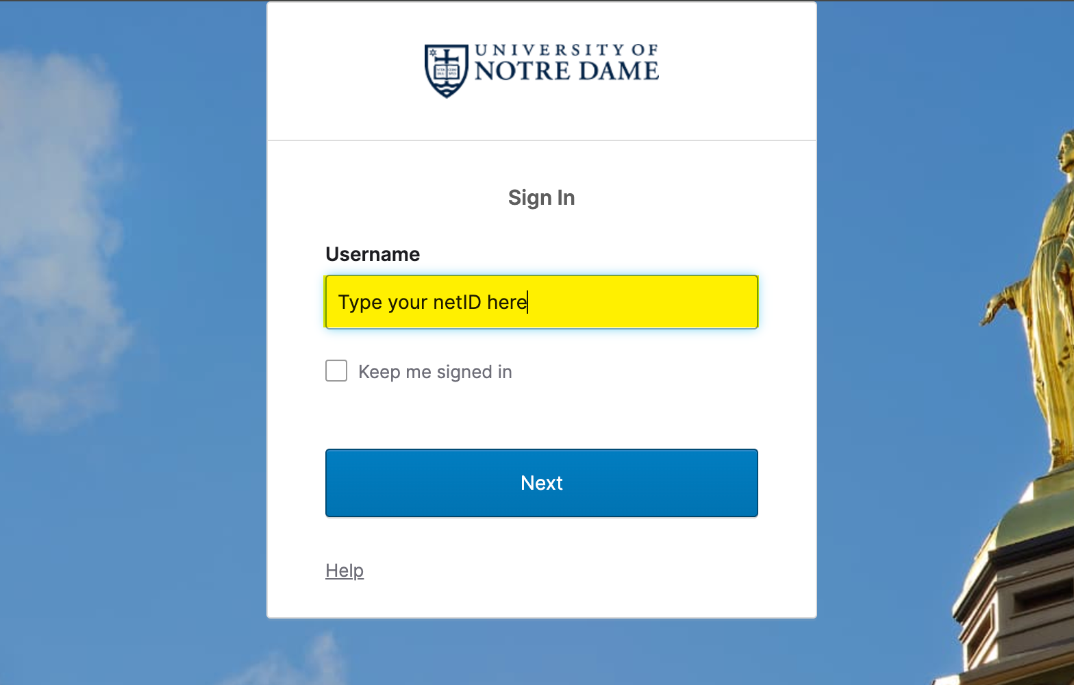 3. You will be redirected to the Notre Dame Okta login screen. Enter your NetID and proceed to log in via Okta.