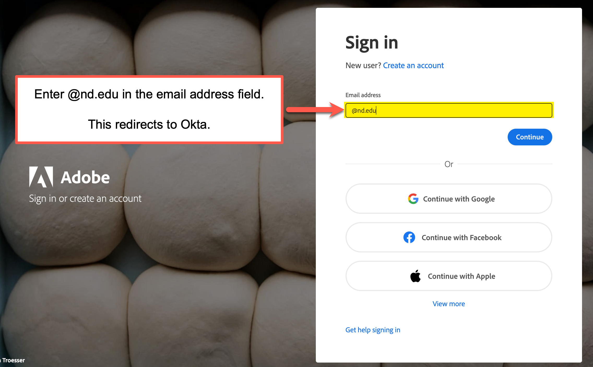 Note: Do NOT use the Google, Apple or Facebook login options (if shown), as those will not work with the ND license agreement: