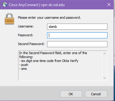 - push: Type "push" without quotes into the Second Password field, then click ok. You should receive a push notification on your mobile device. If you do not see it, open the Okta Verify app, and you should be able to tap Approve