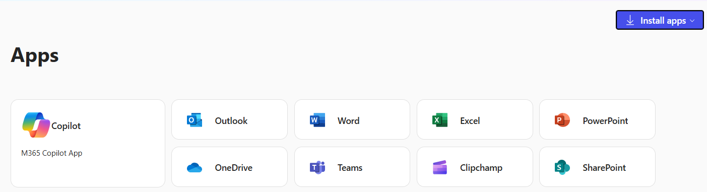 - Install Office: To install the full desktop applications on your computer, look for the "Install apps" button in the top right corner. Click on it and select "Microsoft 365 apps" (or similar wording, as the precise text can vary slightly with updates).
