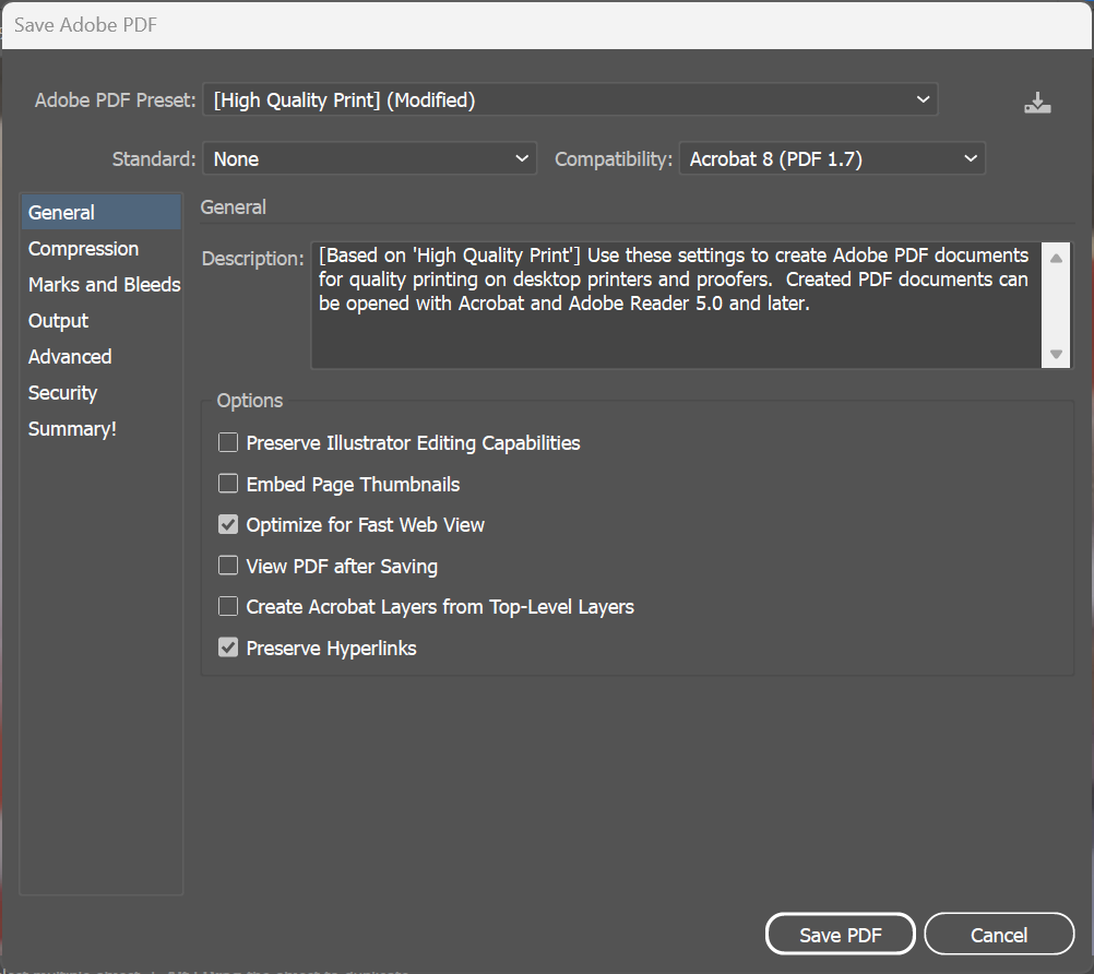 In the Save As Adobe PDF window, set Adobe PDF Preset to [High Quality Print]
