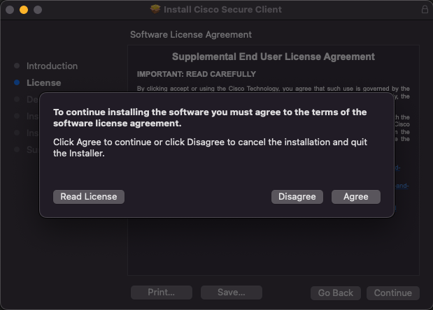 - Click Continue, then Agree on the Software License Agreement prompts.