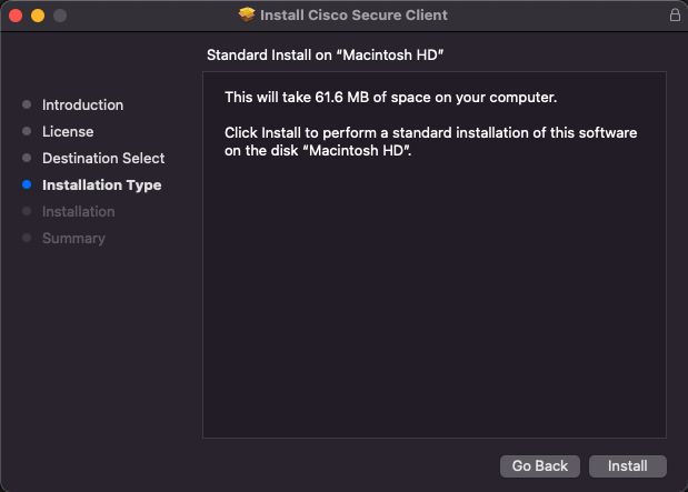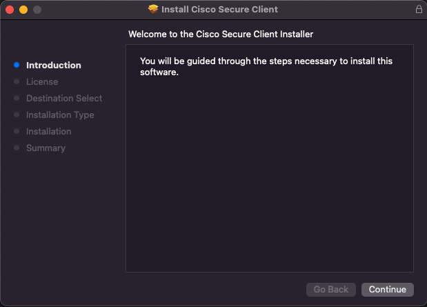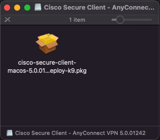 Mac: Open the program by going to Finder, Applications, Cisco, Cisco Secure Client