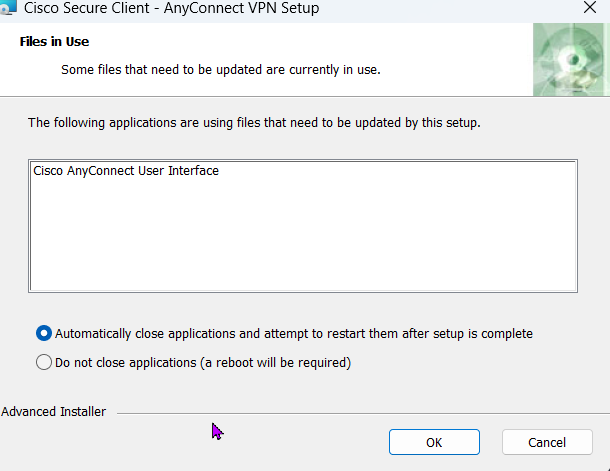 - If you see a message that Cisco AnyConnect is currently in use, check the box to Automatically close applications and click OK