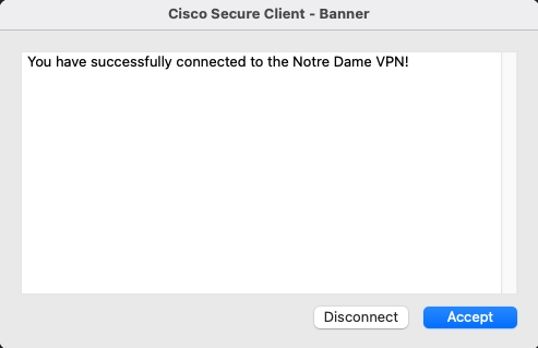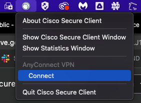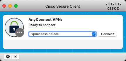 - Cisco Secure Client is added to the menu bar at the top of your Mac. Click on the icon, then Connect. Follow the instructions to connect based on your current affiliation with ND.