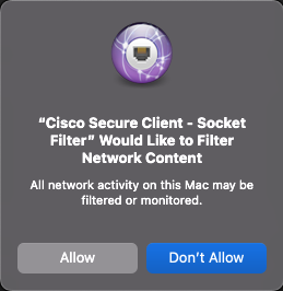 - Click Allow on the additional prompt for Cisco Secure Client - Socket Filter.